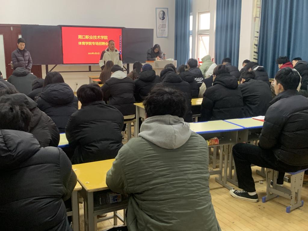 本次来我院进行招聘企有:健道弘武体育文化传播有限公司、周口上尊健身俱乐部有限公司、周口市开发区乐高健身游泳俱乐部、周口市开发区乐高健身游泳俱乐部、周口市熊猫运动生活馆、周口市开发区汗马俱乐部等多家企业公司来我院招聘。各企业招聘负责人依次进行宣讲,详细介绍了公司的业务范围、企业文化以及对体育专业人才的需求方向。