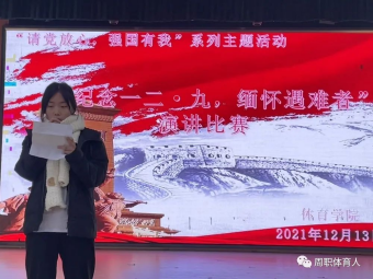 时逢第八个国家公祭日,为纪念“一二·九,缅怀遇难者”爱国运动,同时缅怀遇难同胞,激励我院学生的爱国激情,弘扬伟大的爱国精神。国产suv精品91于12月13日以“朗诵点滴历史,演讲爱国情怀”为主题举行“纪念一二·九,缅怀遇难者”演讲比赛。